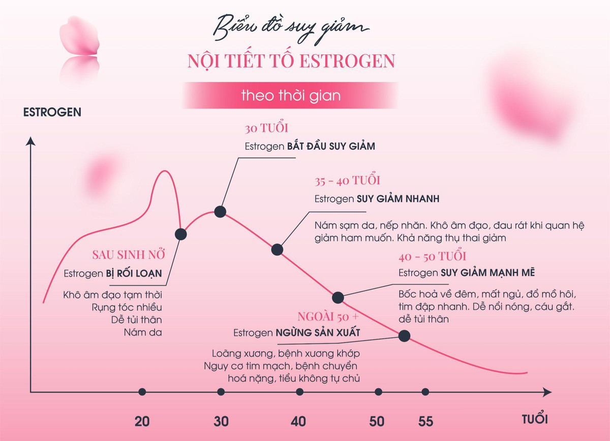 Đối với nữ, estrogen đạt đỉnh giai đoạn sinh sản (25-30 tuổi) sau đó bắt đầu giảm dần và giảm rõ rệt khi bước vào thời kỳ tiền mãn kinh, đến giai đoạn mãn kinh thì ngừng sản xuất.