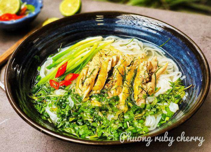 - Bánh phở đem chần nóng rồi chia ra các bát. Sau đó xếp thịt gà đã thái lên trên, rắc lá chanh, hành lá thái nhỏ, thêm phần trắng hành lá chần tái, rồi chan nước dùng. Khi ăn, thưởng thức kèm rau thơm, tương ớt, giấm tỏi nếu thích!