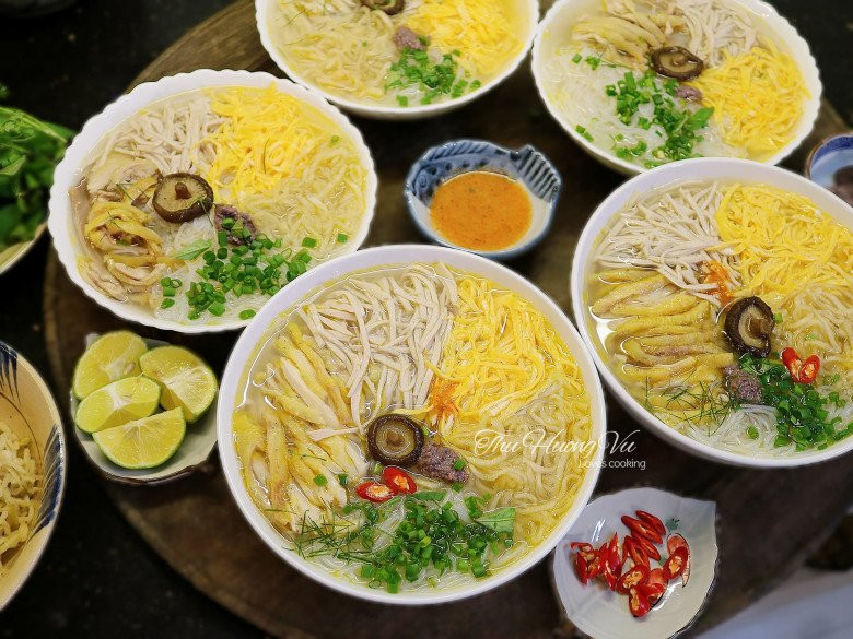 - Nấu nước dùng: Xương đuôi  heo, cổ gà rửa sạch, sau đó cho vào nồi nước ninh nhỏ lửa để nước dùng trong.
