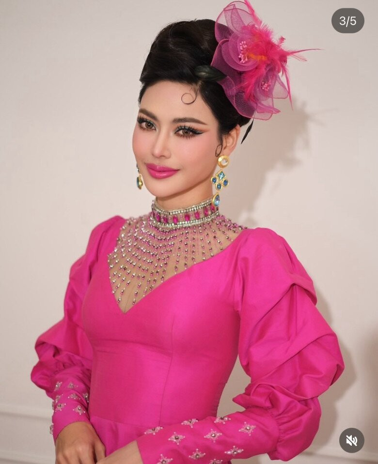 Sarunrat Puagpipat khoác lên người chiếc váy xuyên thấu màu trắng bạc, được đính hàng ngàn viên đá tỉ mỉ và kỳ công trong nhiều ngày liền.