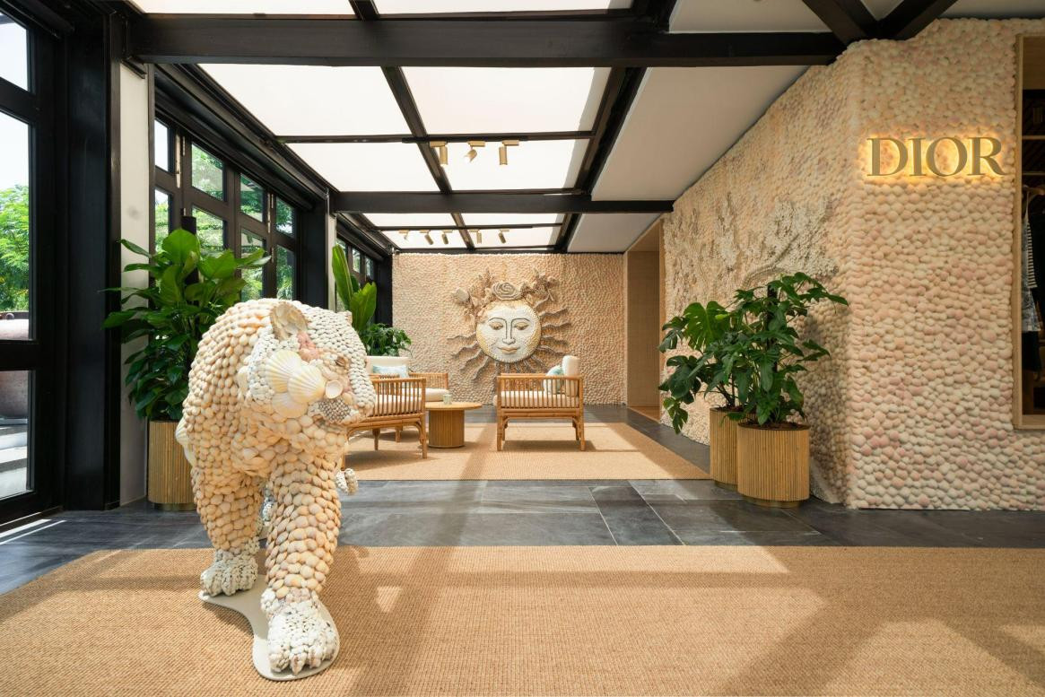Một trong những điểm nổi bật của sự hợp tác lần này là Dior Café, với các lối đi được trang trí bằng tác phẩm điêu khắc động vật hoang dã và các hình hoạ mặt trời được làm từ vỏ sò đẫm chất Dior.