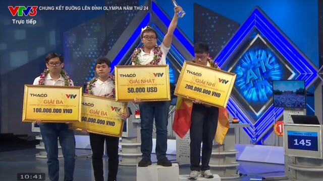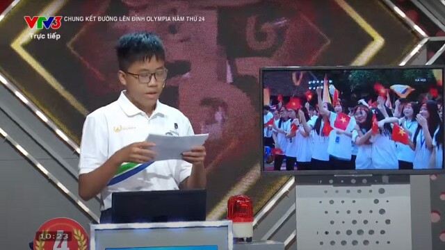 Sáng 13/10, trận chung kết Đường lên đỉnh Olympia năm 2024 được diễn ra với sự tranh tài của 4 thí sinh Nguyễn Nguyên Phú (Trường THPT chuyên Đại học Sư phạm Hà Nội), Nguyễn Quốc Nhật Minh (Trường THPT Chuyên Hùng Vương - Gia Lai), Võ Quang Phú Đức (Trường THPT Chuyên Quốc học Huế) và Trần Trung Kiên (trường THPT Lê Hồng Phong - Phú Yên).