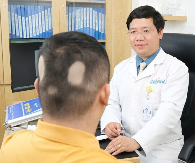 Một người đàn ông bị rụng tóc mảng được bác sĩ Tiến Thành thăm khám. Ảnh: BSCC.