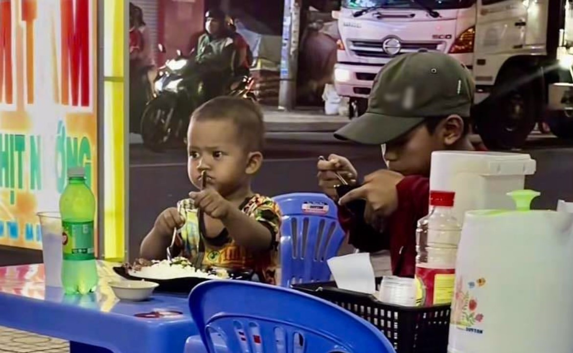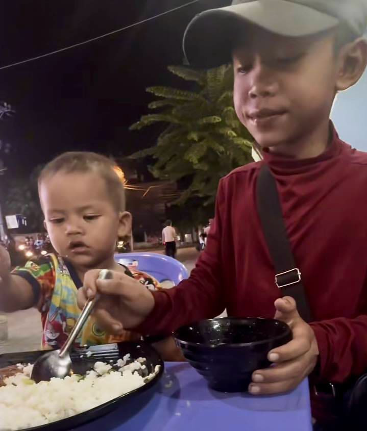 Thấy vậy, chủ quán đã gọi hai bé vào hỏi thăm và làm một phần cơm cho hai đứa trẻ lót dạ rồi lại tiếp tục lên đường mưu sinh. Nhìn hai đứa trẻ ăn suất cơm ngon lành mà nhiều người không khỏi xót xa, chắc hẳn các em rất đói bụng và lâu lắm rồi mới được một bữa ăn ngon như vậy. Điều đặc biệt là trong suốt bữa ăn, cậu anh chỉ ăn cơm trắng để nhường lại thịt cho em. “Con để thịt cho em ăn, con ăn cơm với canh được rồi”, câu nói của cậu bé hiểu chuyện thật khiến người lớn phải suy nghĩ rất nhiều.