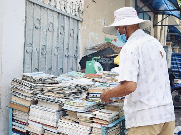 Chiếc xe đẩy nằm nép góc tường chứa hàng trăm quyển sách, báo cũ được ông xếp ngay ngắn thành chồng. Từ sách ngoại văn, sách khoa học, tiểu thuyết, sách giáo khoa… đến cả những cuốn từ lâu đã không còn được tái bản nữa. N