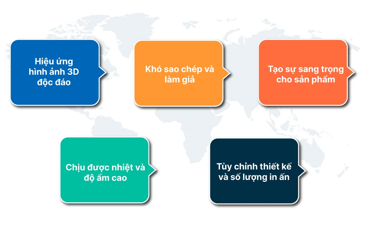- Hiệu ứng hình ảnh 3D độc đáo và thu hút: Nhìn từ các góc độ khác nhau, hình ảnh và màu sắc trên tem hologram sẽ thay đổi theo, hấp dẫn sự chú ý của người nhìn.