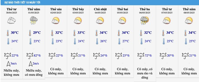 Cảnh báo từ chiều tối 30/4 đến ngày 1/5, ở khu vực Bắc Bộ và Bắc Trung Bộ có mưa rào và rải rác có dông, cục bộ có nơi mưa to với lượng mưa 15-40mm, cục bộ có nơi trên 80mm. Trong mưa dông có khả năng xảy ra lốc, sét, mưa đá và gió giật mạnh. Mưa lớn cục bộ có khả năng gây ra lũ quét trên các sông, suối nhỏ, sạt lở đất trên sườn dốc và tình trạng ngập úng tại các vùng trũng, thấp.