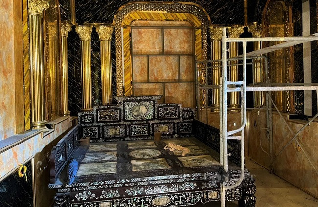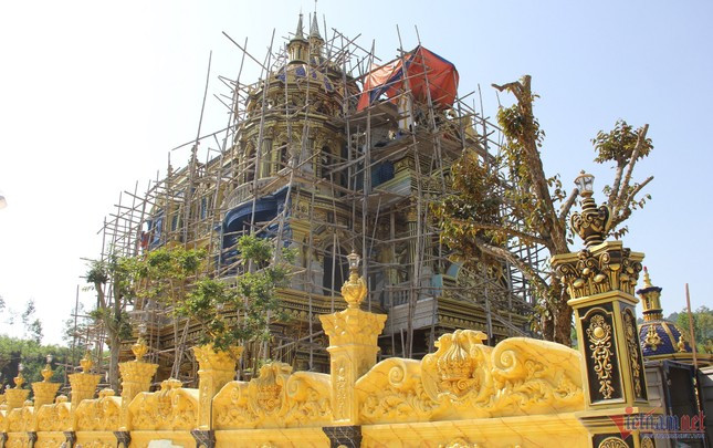Tòa lâu đài đang trong giai đoạn hoàn thành với nhiều tổ thợ thực hiện các công đoạn khác nhau như: sơn, đắp phù điêu, lát gạch, lắp hàng rào… Dự kiến tòa lâu đài sẽ được hoàn thành trong năm 2024.