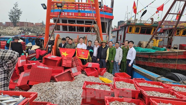 Lãnh đạo phường Nghi Thủy tặng cờ chúc mừng đội tàu ông Lưu đánh bắt được 26 tấn cá cơm.