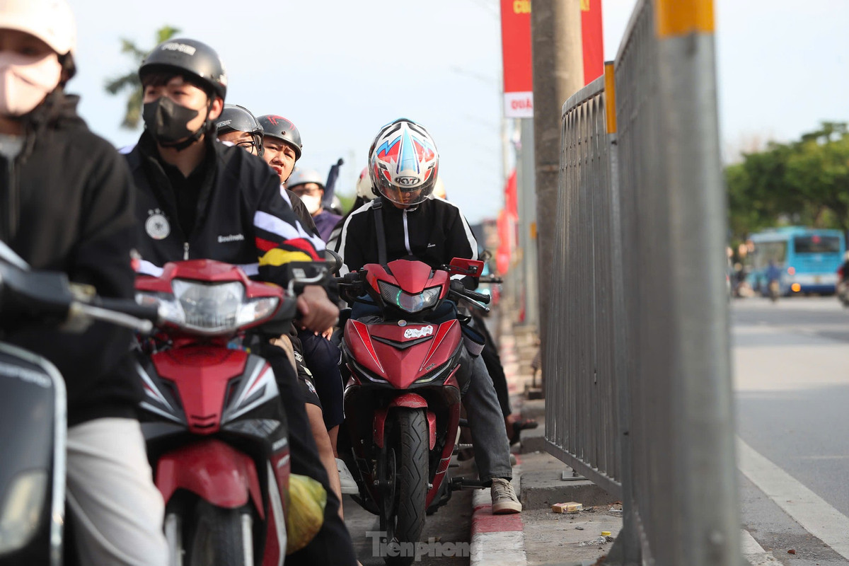 Lòng đường không còn chỗ, hàng trăm người điều khiển xe máy liều mình đi trên vỉa hè.