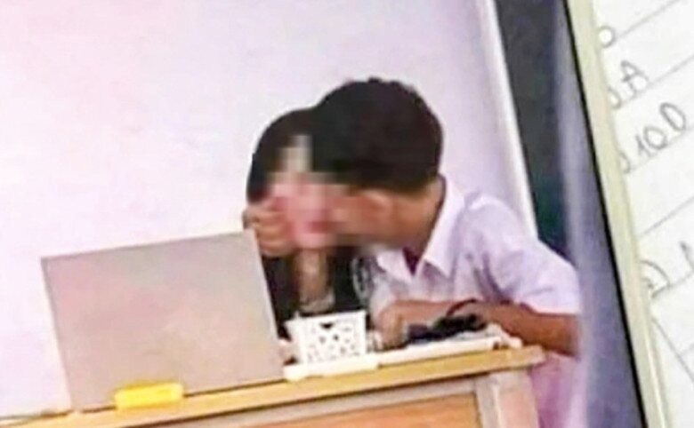 Trước đó, như Báo Người Lao Động đã thông tin, những ngày gần đây mạng xã hội xôn xao với clip một nam sinh cùng một cô gái ngồi tại bàn ghế của giáo viên có những cử chỉ thân mật. Trong đoạn clip, nam sinh đã dùng tay khoác vai cô gái, hai má kề vào nhau, trò chuyện. Đáng chú ý, thời điểm này có rất nhiều học sinh ngồi phía dưới chứng kiến cảnh nêu trên.