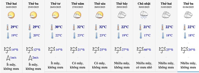 Theo Trung tâm dự báo khí tượng thủy văn Trung ương, từ 24 đến 28/3, khu vực Tây Bắc Bộ ngày nắng, có nơi nắng nóng; riêng từ ngày 26-27/3, có khả năng nắng nóng diện rộng. Sang ngày 28-29/3, Bắc Bộ có mưa rào rải rác, trời chuyển rét.