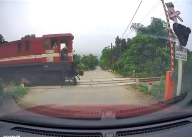 Tuy nhiên, chỉ ít giây sau, barie gác chắn tự động đã mở lên. Thời điểm đó, một người đi xe máy đã chạy ngang qua vị trí giao cắt, còn chiếc ô tô cũng dần dần di chuyển lên. Tuy nhiên, khi đến gần đường sắt, nhận thấy tàu hoả đang tiến đến, tài xế chiếc xe ô tô vội nhấn ga lùi lại phía sau.