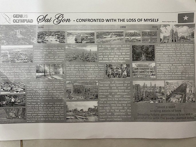 Cả hai bài viết sáng tạo của các em đều có chung tựa đề "Saigon - Facing the loss of myself", đề cập đến vấn đề TP HCM đang mất dần những mảng xanh đô thị. Vì cả M.C. và Q.U đều được đồng hành bởi thầy N.M.T., nên chủ đề và tựa đề bài viết được thầy gợi ý. Tuy nhiên, nội dung làm bài bên trong hoàn toàn khác nhau.