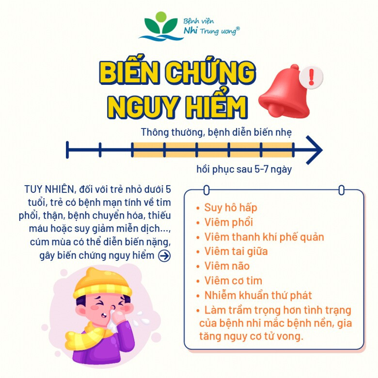 Trường hợp trẻ không được đưa đến viện điều trị kịp thời sẽ rất dễ gây ra biến chứng. Bác sĩ Lâm chỉ rõ một số biến chứng thường gặp ở trẻ, nhất là trẻ dưới 5 tuổi, có bệnh mạn tính về tim phổi, thận, bệnh chuyển hóa... như sau: Suy hô hấp; viêm phổi; viêm não; viêm cơ tim... thậm chí, cúm mùa còn làm trầm trọng hơn tình trạng của bệnh nhi đang mắc bệnh nền và có thể dẫn tới tử vong.