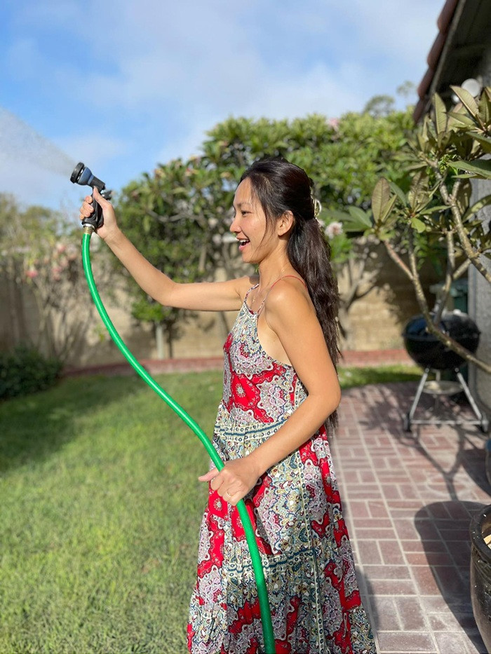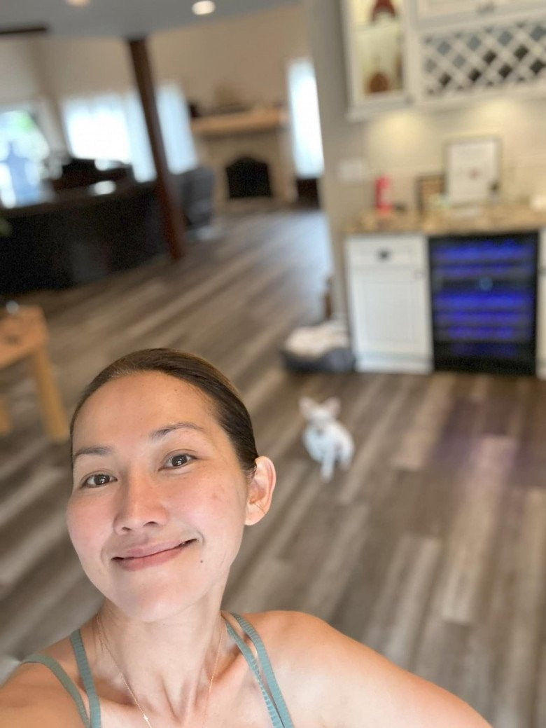 Kim Hiền chia sẻ hình ảnh chào buổi sáng của bản thân tại ngôi nhà mới. Bà mẹ 2 cho biết cô bắt đầu ngày mới rất sớm để có thời gian tập thể dục trước khi làm bữa sáng, đưa các con đi học. Khoảng 6h, cô thư giãn với yoga, hít thở không khí trong lành trong khu vườn đầy hoa lá.