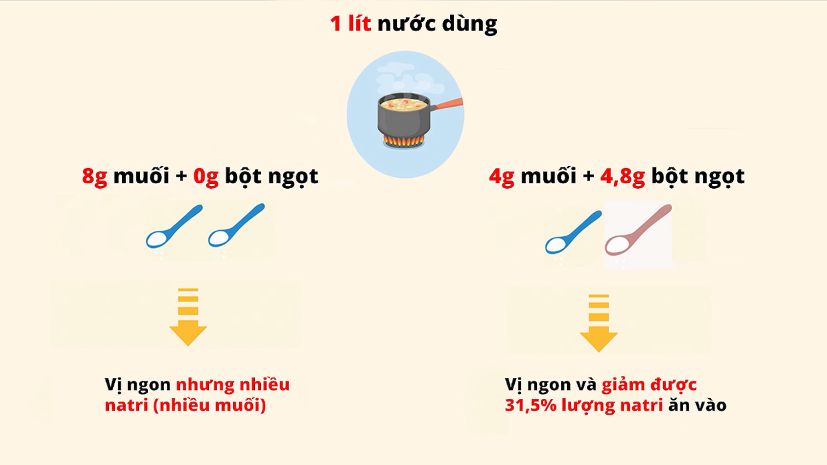 Cách sử dụng: Theo TS.BS Nguyễn Trọng Hưng (Trưởng khoa Khám Tư vấn Dinh dưỡng người lớn - Trung tâm Khám Tư vấn, phục hồi dinh dưỡng & kiểm soát béo phì - Viện Dinh Dưỡng Quốc Gia) thay vì nêm 8g muối cho 1 lít nước dùng, bạn có thể nêm 4g muối và 4,8g bột ngọt. Cách này giúp giảm 31% lượng natri tiêu thụ nhưng vẫn đảm bảo hương vị món ăn thơm ngon.
