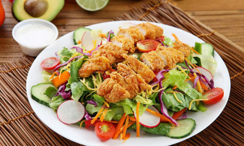 Gà rán giòn, tôm dừa, đậu phụ rán hoặc bất kỳ loại đồ ăn giàu protein nhưng khi rán lên đều bổ sung calo không cần thiết và thêm một đường không tốt cho món salad dành cho người ăn kiêng.