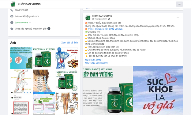 Sản phẩm Khớp Đan Vương được quảng cáo trên Facebook: “Trị dứt điểm đau xương khớp, không cần phẫu thuật, không cần châm cứu, không cần tới những giải pháp trị liệu đắt tiền…”? Ảnh chụp màn hình.