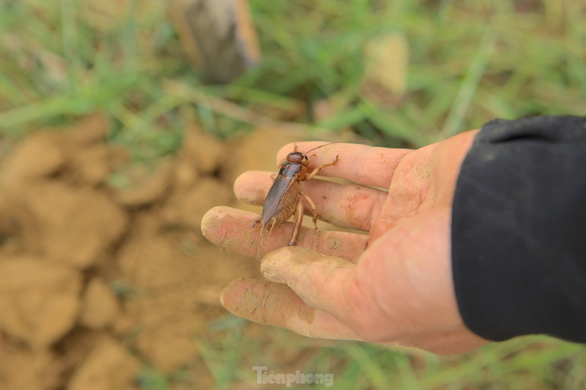 Dịp này anh Phạm Quang Thiết (trú xã Sơn Bằng) cũng ra các cánh đồng bỏ trồng hoa màu của người dân để đào dế. Mang theo can nước và chiếc xẻng, anh đi dọc khắp cánh đồng, khi phát hiện hang dế sẽ dừng lại đổ nước.