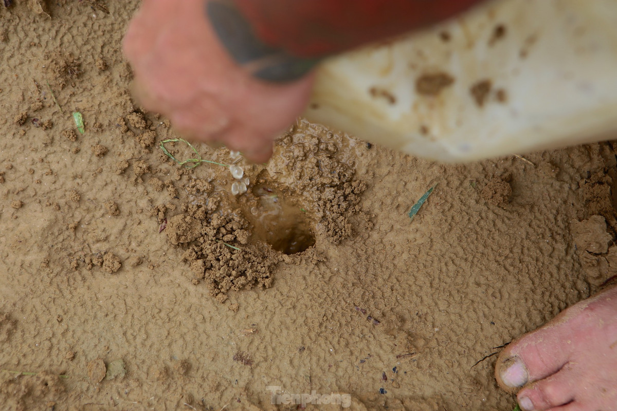 Việc đào hang bằng tay cũng rất nguy hiểm, có khi trong hang không phải những chú dế mà là rắn, rết. Vì thế những người có kinh nghiệm họ mới phân biệt được đâu là hang dế. Trong ảnh người dân dùng nước đổ vào hang dế...