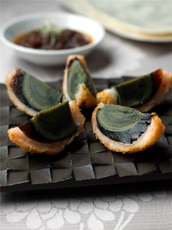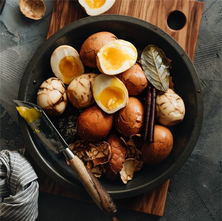 Là món ăn truyền thống của người Hoa, trứng trà được đập một cách thật khéo léo để tạo nên những vết nứt trên vỏ, sau đó đem ngâm trong nước trà và gia vị. Trứng trà cũng được biết đến với cái tên "trứng cẩm thạch" bởi các đường nứt của trứng đôi khi trông như vân cẩm thạch. Loại trứng này có mùi thơm và hương vị đậm đà, nhờ vào các loại gia vị như nước tương hoặc ngũ vị hương.