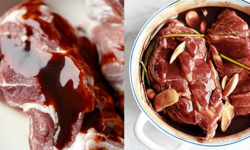Đổ toàn bộ hỗn hợp gia vị vào ướp với thịt. Dùng tay mát xa cho thịt được ngấm đều. Dùng màng bọc thực phẩm bọc kín thịt lại và cho vào tủ lạnh ướp qua đêm là ngon nhất (hoặc không thì ít nhất 3 – 4 tiếng đồng hồ).