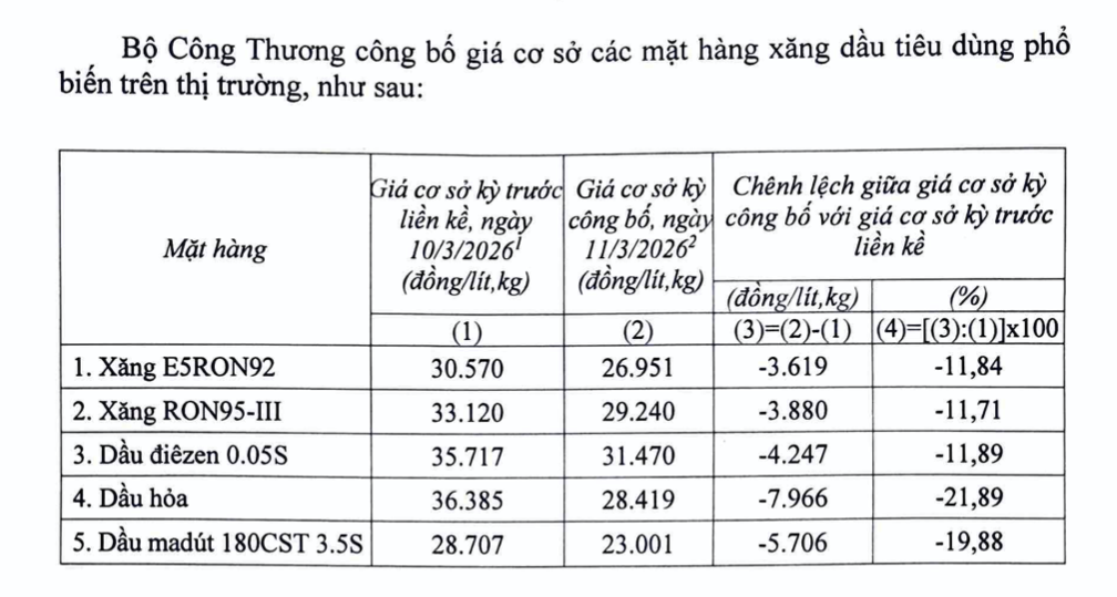 Sau khi thực hiện việc trích lập và chi sử dụng Quỹ Bình ổn giá xăng dầu đối với các mặt hàng xăng dầu như trên, giá Xăng E5RON92 giảm 3.619 đồng/lít so với lkỳ điều hành trước đó. Giá bán mới không cao hơn 22.951 đồng/lít. Xăng RON95-III giảm 3.880 đồng/lít, giá bán mới không cao hơn 25.240 đồng/lít.
