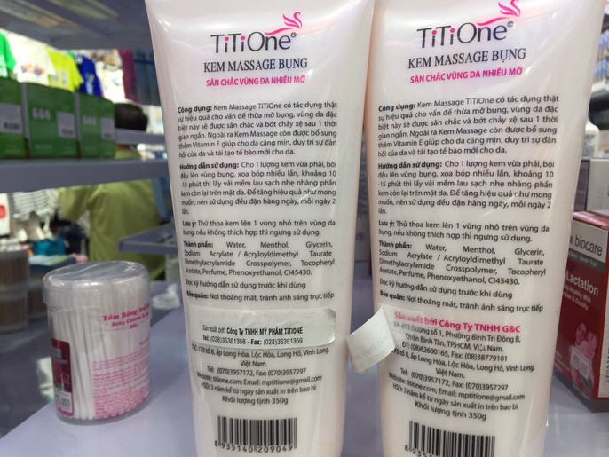 | Kem săn chắc vùng da nhiều mỡ có tem dán tên công ty khác chồng lên tên công ty in trên bao bì. |