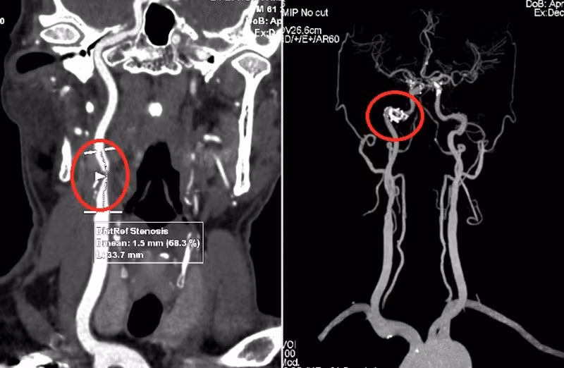 Từ các kết quả thăm khám và cận lâm sàng, bác sĩ kết luận bệnh nhân bị hẹp nặng động mạch cảnh trong bên phải trên nền nhiều bệnh lý mạn tính như: nhồi máu não, tăng huyết áp, đái tháo đường, rối loạn mỡ máu và hội chứng vành mạn – đây là những yếu tố làm gia tăng nguy cơ đột quỵ tái phát nếu không được kiểm soát tốt.