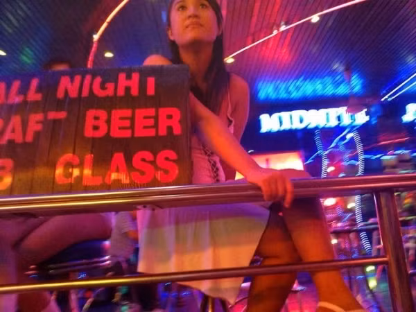 | Những nữ tiếp viên trong trang phục gợi cảm đứng bên ngoài một quán giải trí đón chào khách hàng. |