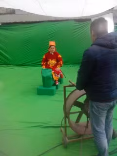 Nghệ sĩ Tự Long đang tạo dáng Táo cưỡi trên mây để đi lên thiên đình. Tấm phông xanh phía sau cho thấy, những cảnh quay này sẽ được dùng kỹ xảo máy tính để mang đến cho khán giả những hình ảnh hấp dẫn.