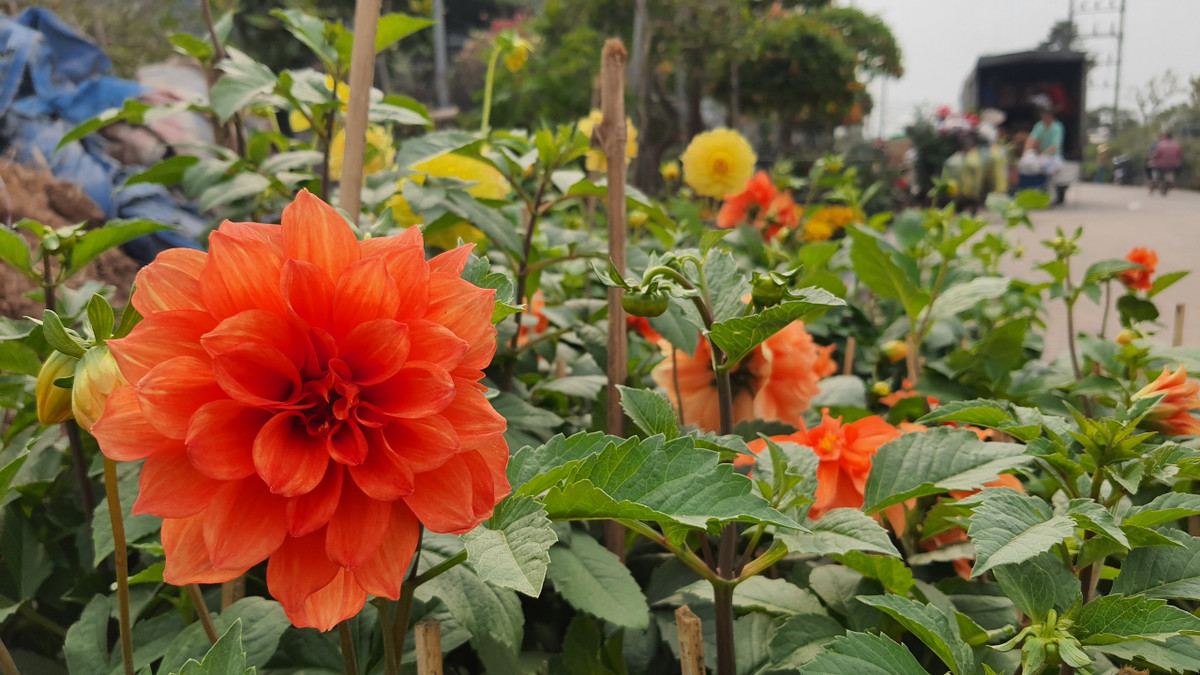 Hoa thược dược được bán với giá 20 nghìn đồng/ chậu, đây là mặt hàng bán khá chạy vì rẻ.