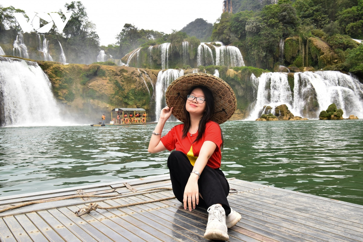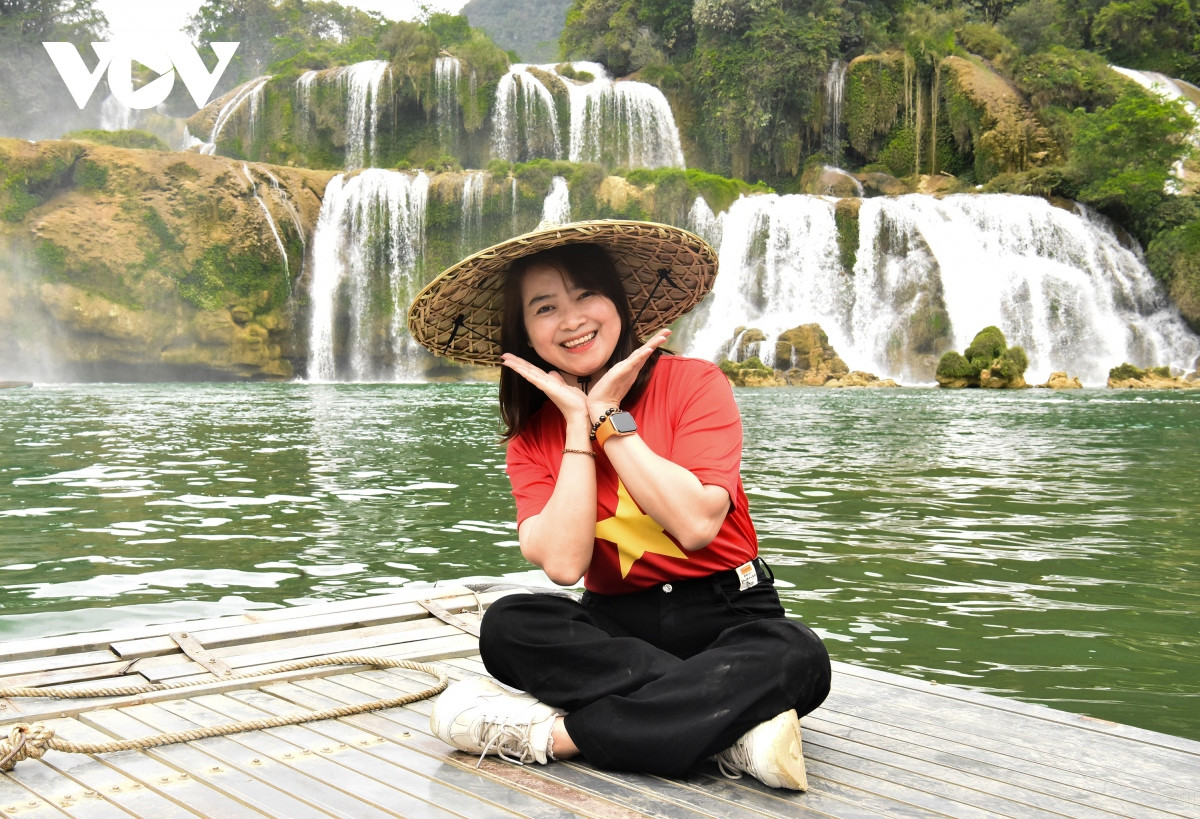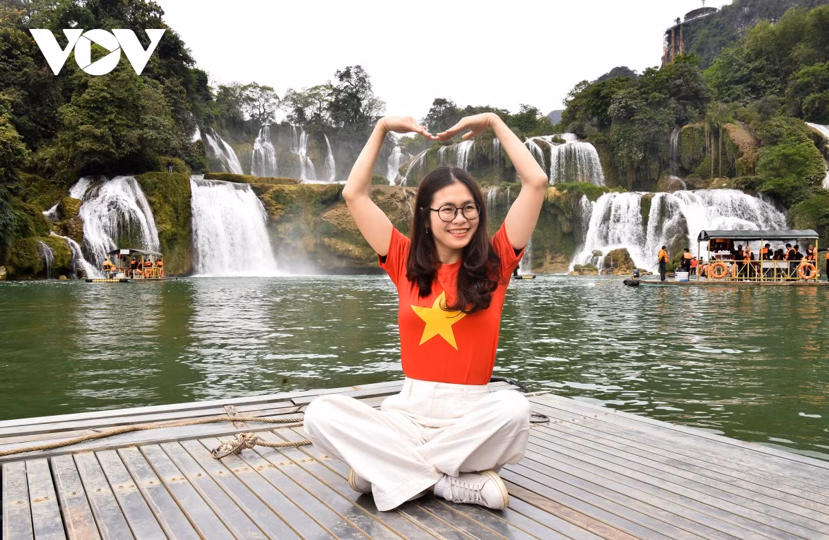 Du khách mặc áo cờ đỏ sao vàng “check in” bên thác Bản Giốc
