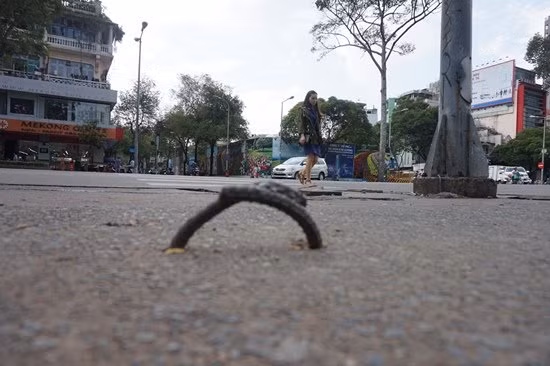 Những móc sắt nhô cao hơn mặt đường từ 5-7 cm, ngay góc đèn xanh đèn đỏ có lối băng ngang người đi bộ đã tạo thành “bẫy” khiến nhiều trường hợp khách nước ngoài ngã chúi mũi.