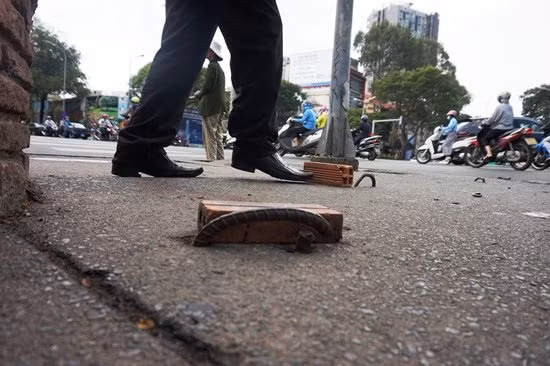 Do thấy nhiều người bị ngã, người dân địa phương phải lấy gạch chắn ngang móc sắt, giúp người đi bộ nhận biết nguy hiểm.