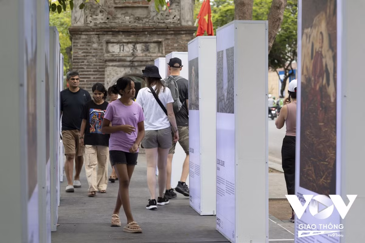 Du khách đến xem một triển lãm ảnh được tổ chức ngoài trời, trên phố đi bộ hồ Hoàn Kiếm.