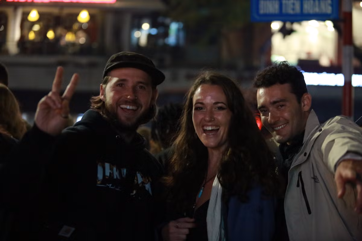 Nhiều du khách nước ngoài cùng nhau nói chúc mừng năm mới đến những người Việt Nam hiếu khách.