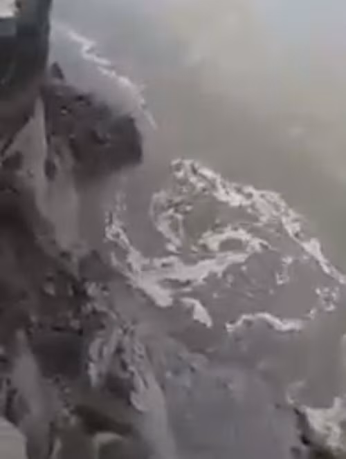 Chẳng ngờ, khi đang mải quan sát xoáy nước phía dưới, người đàn ông này bỗng nhiên hốt hoảng ngã nhào vì vách đá đột nhiên đổ sụp, sạt lở thần tốc