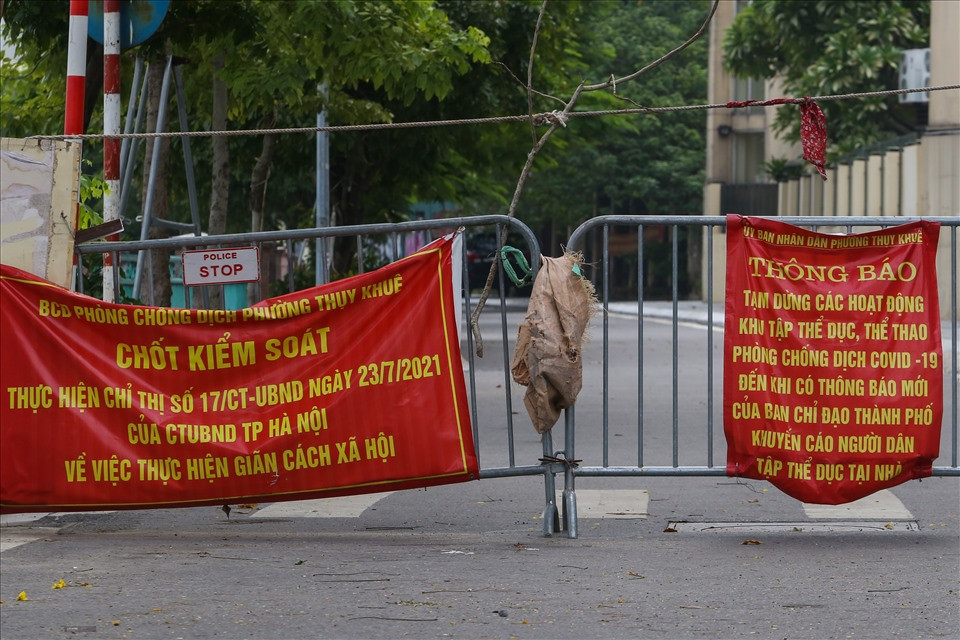 Tuy đã được nới lỏng giãn cách, tuy nhiên các chốt kiểm soát cấp phường, quận, tổ dân phố vẫn chưa được dỡ bỏ. Trên hình là rào cứng ven hồ Tây (Tây Hồ).