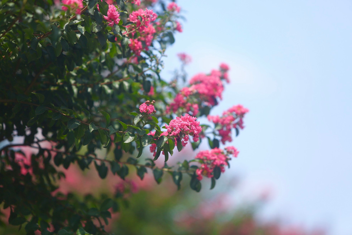 Những bông hoa tường vi cánh mỏng nổi bật trên cung đường với vẻ đẹp mộc mạc. Từng chùm hoa rung rinh khoe sắc hồng giữa nắng hè.