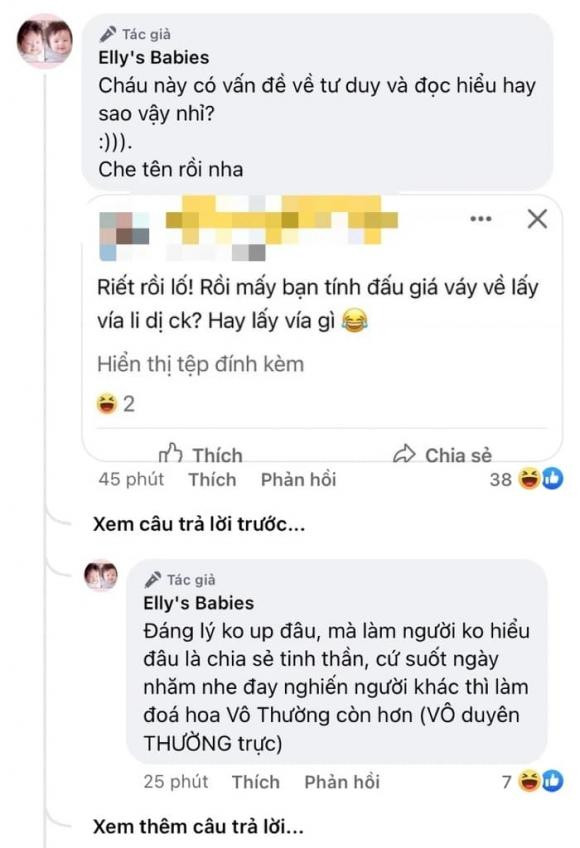 Tuy nhiên, cô bị cư dân mạng chê bai vì hành động này: "Riết rồi lố. Rồi mấy bạn tính đấu giá váy lấy vía về li dị chồng? Hay lấy vía gì?" Elly Trần thẳng thắn đáp trả: "Cháu này có vấn đề về tư duy và đọc hiểu hay sao vậy nhỉ? Che tên rồi nha". Cô nói thêm: "Đáng lý không đăng đâu, mà làm người không hiểu đâu là chia sẻ tinh thần, cứ suốt ngày nhăm nhe đay nghiến người khác thì làm đoá hoa vô thường còn hơn (vô duyên thường trực)". Nữ diễn viên thở dài: "Trời sinh khuôn mặt hài hoà. Ai dè cái mỏ đúng là quá cha! Chị em phụ nữ không thương hay ủng hộ nhau thì thôi, đằng này cứ soi mói ý kiến mà còn vậy là không được rồi".