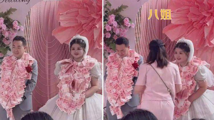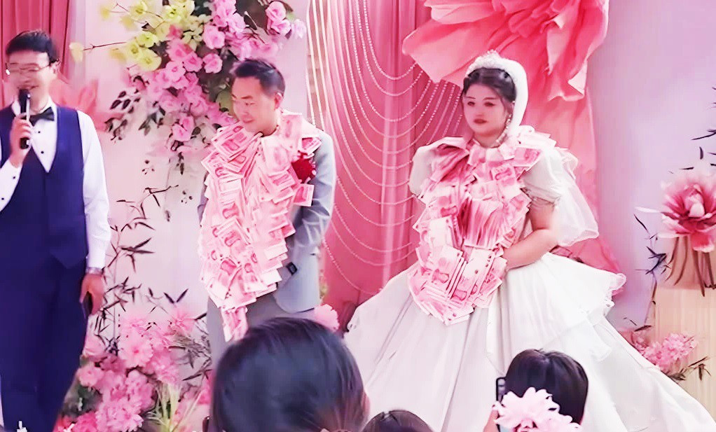 Một đoạn video đăng tải trên mạng xã hội cho thấy, có rất một hàng dài chị em phụ nữ xếp hàng lên sân khấu trao tặng quà cưới, mỗi người tặng cô dâu chú rể 1 vòng hoa trị giá 10.000 nhân dân tệ (khoảng 35 triệu đồng). Khách mời rất bất ngờ khi biết được đó là 8 chị gái của chú rể.