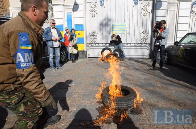 Người biểu tình đốt bánh xe trước cửa dinh thự của ông Poroshenko ở quân Koncha-Zaspa, thành phố Kiev.