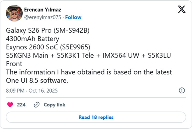 Thông tin rò rỉ về Galaxy S26 Pro trên mạng xã hội X.