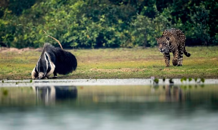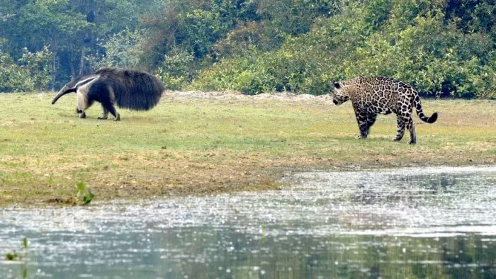 Cũng có lẽ vì ngại ngần kích thước khổng lồ và những móng vuốt sắc nhọn của thú ăn kiến, sau một hồi cân nhắc lợi hại, báo đốm đã quyết định từ bỏ con mồi tiềm năng.
