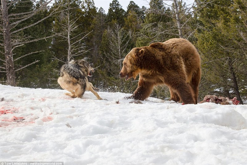 Con gấu láu cá dùng sức mạnh của mình để đánh đuổi sói xám nhằm giành lấy miếng mồi ngon.