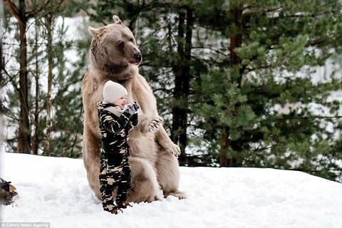 Những bức ảnh đặc biệt khiến nhiều người kinh ngạc về khoảnh khắc chú gấu khổng lồ vui đùa thoải mái cùng em bé bên trong khu rừng ở Nga.