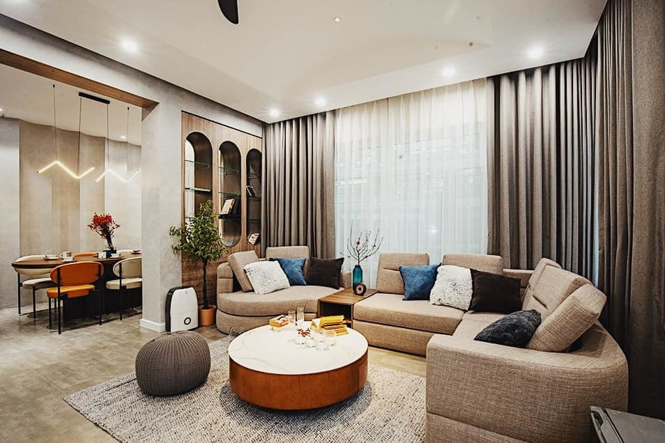 Phòng khách đổi khác khi thêm sàn gạch, bộ sofa hình vòng cung và bức tường kết hợp kệ gỗ trang trí. Gam mầu ấm giúp không gian dễ chịu, gần gũi hơn so với màu sơn trắng nhạt nhòa cũ.