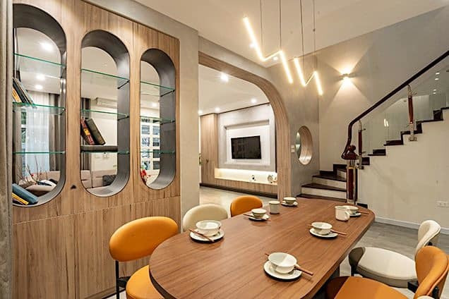 Tủ bếp kịch trần, màu gỗ ấm thay cho tủ cũ, cất giấu được nhiều đồ hơn. Anh Quý không dùng cánh cửa kính để tạo cảm giác phòng luôn gọn, tránh hình ảnh lộn xộn làm mất thẩm mỹ. Bộ bàn ăn với ghế màu cam nổi bật. Tủ kệ ngăn phòng có lớp kính, có thể quan sát bên ngoài.